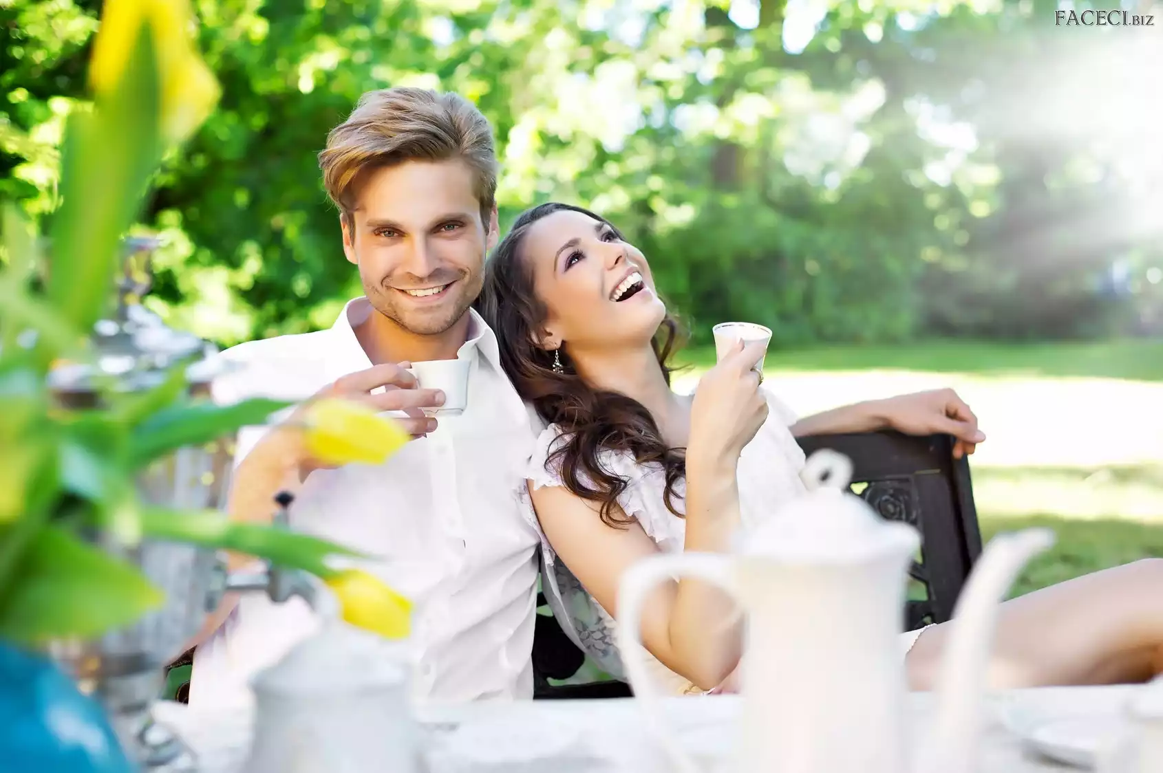 Ogród, Kobieta, Rozmycie, Tulipany, Mężczyzna, Ławka - faceci.biz
